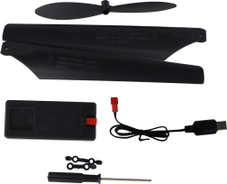 RC-Helikopter, Fernsteuerung, USB-Ladegerät, Ersatzpropeller, Schraubendreher, Bedienungsanleitung, Originalverpackung