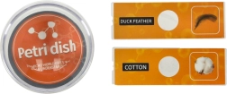 Zum Set gehören zwei vorbereitete Objektträger mit Proben (Entenfedern und Baumwollfasern) und vier weitere leere Objektträger für die eigene Probenvorbereitung. Dieses Gerät ermöglicht es Kindern, ihre eigenen Proben vorzubereiten, was ihr Interesse und Geschick noch mehr engagiert. Im Paket befinden sich auch Grundwerkzeuge, wie eine Pinzette und ein Kunststoffskalpell, für die einfache Vorbereitung eigener Proben.