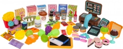 Zum Set gehört eine Tafel zum Zeichnen, eine reichhaltige Auswahl an Lebensmittelimitaten und verschiedene Regale und Ablagen zur Aufbewahrung des Zubehörs. Dieses Spielzeug fördert Kreativität und soziales Spiel unter Kindern.