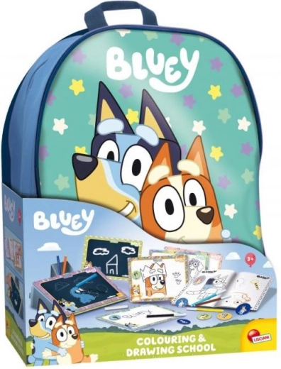 Leichter Kinderrucksack mit buntem BLUEY-Print, der das gesamte Set fasst und das Tragen erleichtert. Ideal zum Kreativsein auf Reisen und zu Hause.