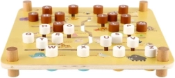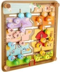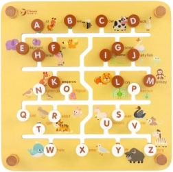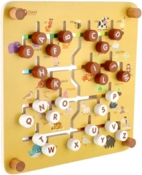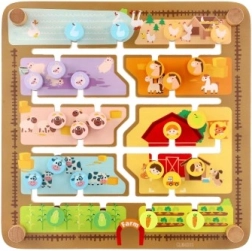 Eine clevere und unterhaltsame Hilfe für Vorschulkinder: Die beidseitige Platte verbirgt zwei Welten. Auf der Bauernhof-Seite schieben Kinder Steine mit Tieren, Gesichtern und Obst entlang gefräster Bahnen an ihren Platz. Durch Umdrehen wird sie zum Alphabet-Labyrinth – Aufgabe ist es, den Stein mit dem Anfangsbuchstaben zum passenden Tier zu führen (Bezeichnungen auf Englisch), so werden Buchstaben und Wortschatz spielerisch geübt.