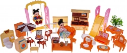 Küche, Bad, Schlafzimmer, Musikecke, Möbel, Zubehör, 2 Puppen, 2 Hündchen und verschiedene Spielelemente für endlosen Spaß.