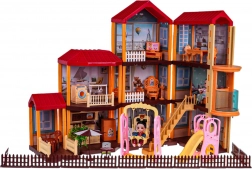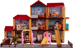 Dieses geräumige Puppenhaus aus Kunststoff in lebendigen Farben bietet Kindern unzählige Möglichkeiten für kreatives Spielen. Das Innere umfasst Küche, Bad, Musikzimmer, Wohnzimmer, Schlafzimmer, Ankleidezimmer und Tageszimmer. Rund um das Haus gibt es einen Zaun und eine Außenfläche mit Sitzbereich, Sonnenschirm und einem Spielplatz mit Rutsche und Schaukel.
