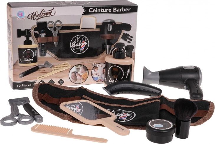 . | Gut ausgestattetes Friseur-Set mit Gürtel für Kinder ab 3 Jahren. Das Set besteht aus 10 Teilen und wurde aus hochwertigsten Materialien hergestellt, die eine lange Nutzungsdauer gewährleisten. Das Set enthält: Gürtel, Rasierer, Haartrockner, elektrischen Rasierer, Schere, Kamm, Spiegel, Bürste, Flasche mit Kosmetikpumpe, Schaumdöschen. Mit einem so gut ausgestatteten Set kann Ihr Kind das Schneiden, das Modellieren von Bärten oder Frisuren nachspielen. Der Gürtel kann über die Hüften gehängt werden, sodass alle Elemente des Sets hineinpassen. Der Föhn hat eine Beleuchtung und Trockengeräusche. Er wird mit 2 x AAA 1,5V Batterien betrieben (nicht im Lieferumfang enthalten).