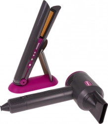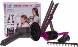 Ideales Friseursatz für Kinder, die kleine Friseurinnen werden möchten. Umfangreich ausgestattetes Set enthält einen Föhn mit austauschbaren Aufsätzen, einen Haarglätter, einen Kamm und eine Bürste. Der Föhn wird mit zwei AA-Batterien betrieben (nicht im Lieferumfang enthalten) und erzeugt Geräusche wie beim echten Föhnen. Der Haarglätter leuchtet und erzeugt typische Geräusche, wenn er eingeschaltet ist.