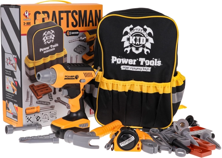 Das Kinderspielzeug-Set mit Rucksack enthält alles, was ein kleiner Handwerker benötigt. Umfangreiche Ausstattung umfasst 28 Elemente, darunter Maßband, Hammer, Zangen, Schraubenschlüssel und vieles mehr.