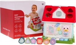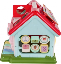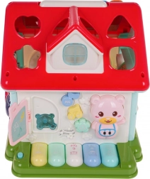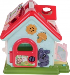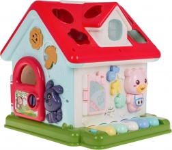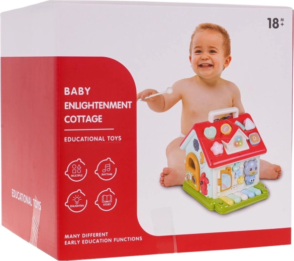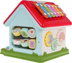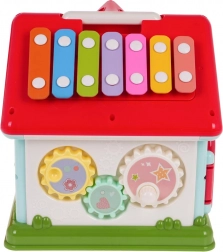 Buntes interaktives Häuschen für Kinder ab 18 Monaten mit Musiktasten, Lichteffekten, Xylophon, Formensortierer und drehbaren Elementen zur Förderung der Feinmotorik sowie zum Lernen von Zahlen, Tieren und deren Geräuschen. Leichter, widerstandsfähiger Kunststoff und ein praktischer Tragegriff erleichtern das Mitnehmen.