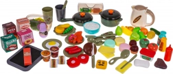 Topf, Pfanne, Besteck, Teller, Lebensmittel mit Klett, Getränke, Gewürze, Kreidetafel und Aufkleber – alles für kreatives Kochen.