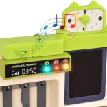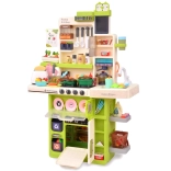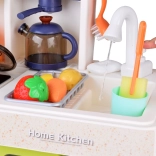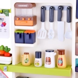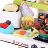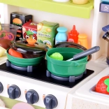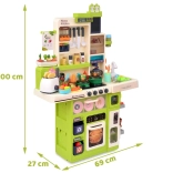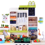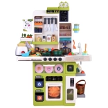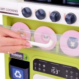 Die multifunktionale Küche in beruhigenden Farben bietet Kindern ein authentisches Kocherlebnis: zwei beleuchtete Kochfelder mit Geräuschen, ein sicherer Dampfeffekt, ein funktionierender Wasserhahn mit Umlaufwasser sowie öffnende Backofen-, Kühlschrank- und Schranktüren für übersichtliche Aufbewahrung. Dank Musikpanel mit Lichteffekten, Nachrichtentafel und Uhr mit beweglichen Zeigern wird das Spiel noch abwechslungsreicher.