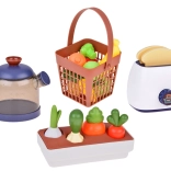 Teller, Töpfe, Pfanne mit Deckel, Kännchen, Besteck, Küchenutensilien, Gemüsekorb, Lebensmittel, Soßen, Gewürze und ein Toaster mit Toast – alles griffbereit für kreatives Rollenspiel.