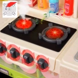 Zwei beleuchtete Kochfelder leuchten nach dem Drehen des Knopfes rot auf, starten realistische Geräusche und erzeugen nach Zugabe von Wasser einen sicheren Dampfeffekt – fast wie in einer echten Küche.