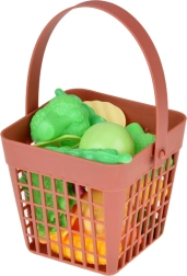 Die Küche enthält verschiedenes Geschirr, Töpfe, Besteck und Spiellebensmittel, darunter einen Gemüsekorb und Sortier-Zubehör.