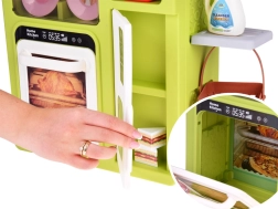 Die Küchenzeile ist in gedeckten Farben gehalten und passt daher perfekt in jedes Kinderzimmer. Dank vieler zu öffnender Elemente wie Schränken, Backofen und Kühlschrank können auch Kleinkinder ihr Küchenset ordentlich verstauen.
