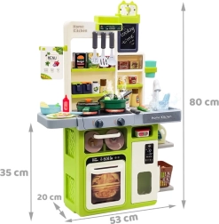 Der Spielspaß mit dieser Küche ist außergewöhnlich dank Funktionen wie beleuchteten Kochfeldern, Kochgeräuschen und einem Dampfeffekt, der aus den Töpfen aufsteigt und so echtes Kochen imitiert. Kinder können zudem „Geschirr spülen“, indem sie den Wasserhahn benutzen, was das Spiel noch authentischer macht.