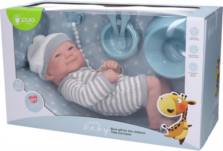Entdecken Sie den Zauber des Spielens mit der Puppe Baby mit Töpfchen. Diese realistische Puppe mit einer Größe von 35 cm ist der perfekte Begleiter für jedes Kind, das die Welt der Babypflege erkunden möchte. Enthält: