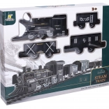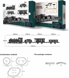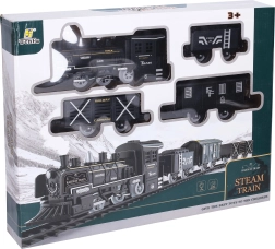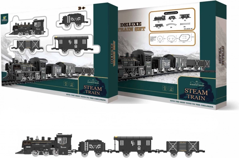 Das Set enthält eine Lokomotive (20 cm), drei Waggons (10–15 cm), gerade und gebogene Schienen sowie einen Wasserbehälter zur Erzeugung eines realistischen Raucheffekts. Die Stromversorgung erfolgt über 4 × AA-Batterien (nicht enthalten). Der ON/OFF-Schalter befindet sich auf der linken Seite der Lokomotive, der Wassertank liegt unter dem silbernen Schornstein.