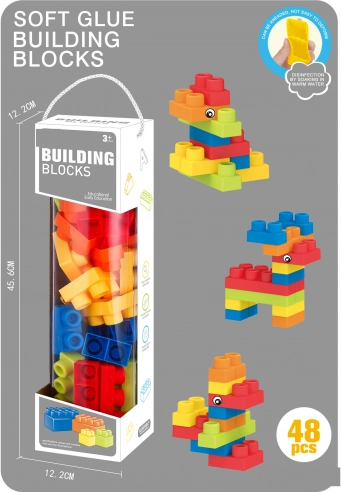 Weiches Baukasten-Set mit 48 Teilen für sicheres und kreatives Spielen von Kindern, unterstützt Motorik und Fantasie.