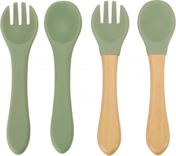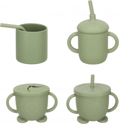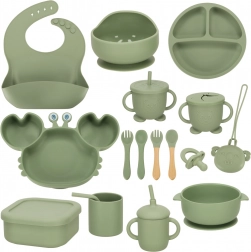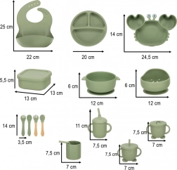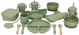 Dieses 19-teilige Set aus grünem Silikongeschirr ist mit Blick auf die Sicherheit und den Komfort Ihrer Kinder gestaltet. Dank robustem Silikon ohne schädliche Stoffe sind diese Produkte ideal für zarte Kindergaumen. Farbe und Design machen jede Mahlzeit unterhaltsam und fördern die Entwicklung manueller Fähigkeiten.