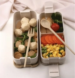 Zum Lieferumfang gehört auch ein Besteckset aus Weizenstroh. Diese praktischen Werkzeuge umfassen einen Löffel und eine Gabel mit geriffelter Kante, die als Messer dienen kann. Das Besteck lässt sich leicht in der Lunchbox verstauen, sodass Sie es immer zur Hand haben.