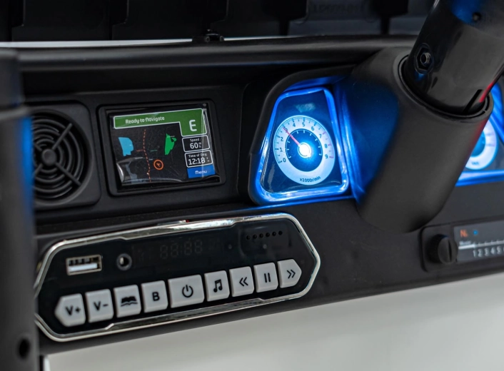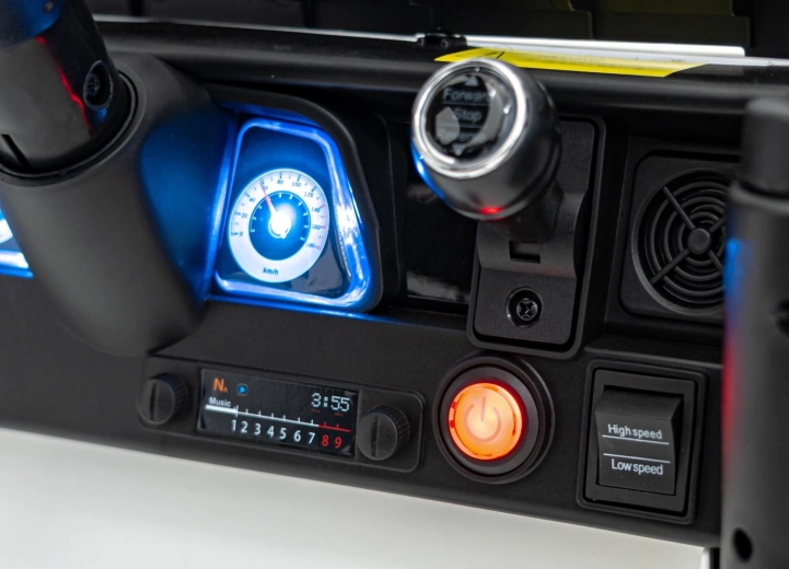 Front-, Heck- und obere LED-Lichter sowie ein Panel mit USB/MP3/Bluetooth/AUX sorgen für ein authentisches Fahrerlebnis.