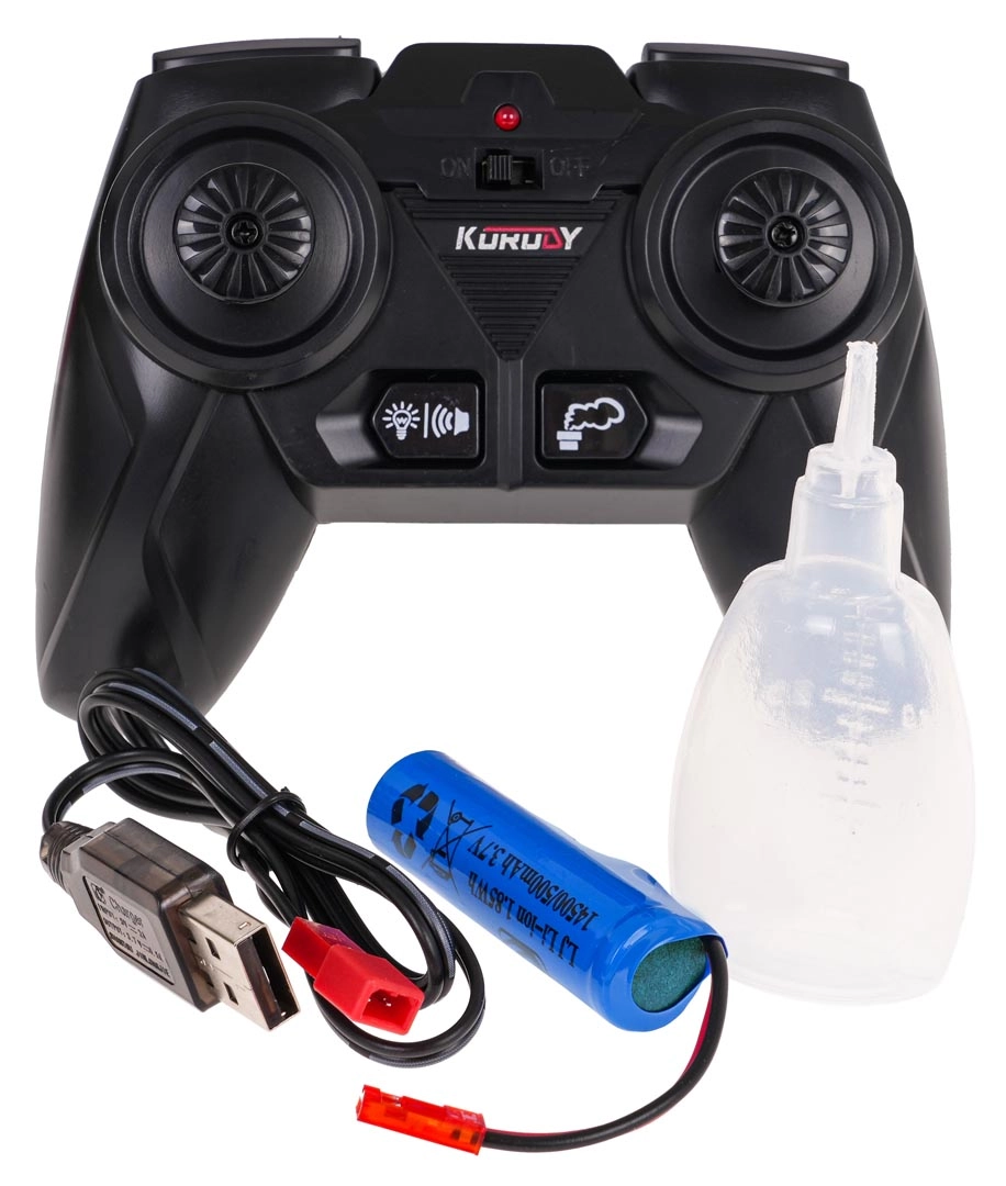 Die 2,4-GHz-Fernsteuerung ermöglicht eine sanfte Steuerung vorwärts, rückwärts, rechts und links ohne Störungen. Der integrierte 3,7 V 500 mAh Li-Ion-Akku liefert ausreichend Energie fürs Spielen, das Aufladen erfolgt per USB. Den Raucheffekt aktivieren Sie mit der beiliegenden Wasserflasche für ein noch realistischeres Erlebnis.