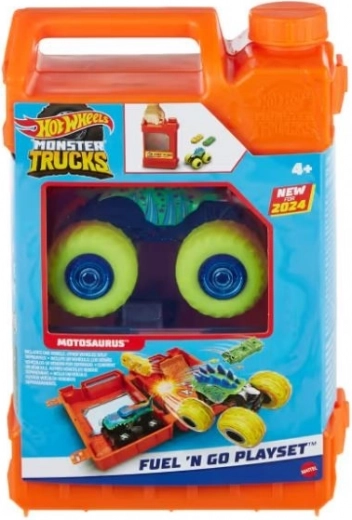 Hot Wheels Monster Trucks Kannister Fuel 'N Go ist ein fantastisches Spielset für Kinder ab 4 Jahren. Entdecke die Welt der Stuntshows und Abenteuer mit einem einzigartigen, kannisterförmigen Design, das den Monster Truck Motosaurus enthält.