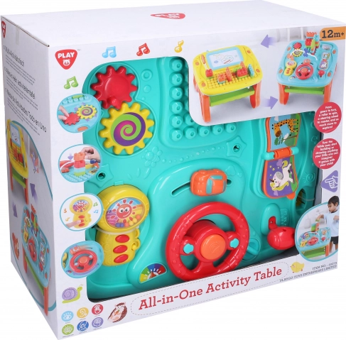 Beidseitiger Aktivitätstisch 37 cm: Lenkrad, Schalthebel, Rasseln, magnetische Maltafel und Bauplatte für Bausteine. Melodien und Batterien inklusive.