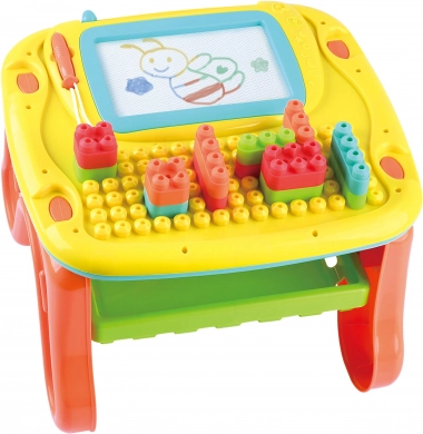 Der unterhaltsame beidseitige Tisch für Kinder bietet zwei Spielflächen in einem: Auf der Oberseite finden Sie Lenkrad, Schalthebel und Rasseln, auf der Unterseite eine magnetische Maltafel und eine Bauplatte für Bausteine. Im Lieferumfang sind Bausteine, Melodien und Batterien enthalten, sodass er sofort einsatzbereit ist. Die kompakte Größe von 37 cm passt in jedes Kinderzimmer.