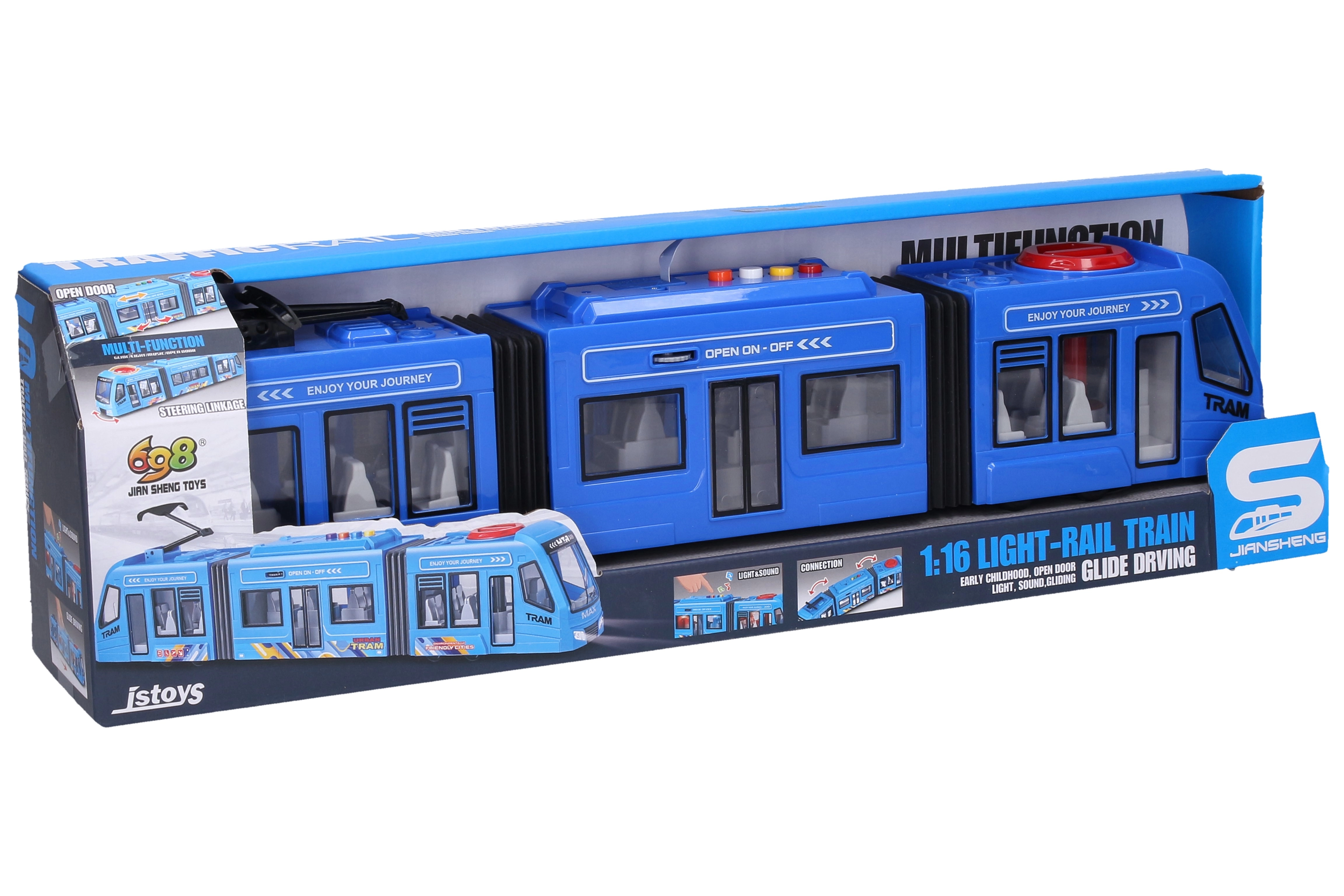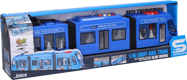Realistische Straßenbahn für kleine und große Fans des Stadtverkehrs. Bietet Licht- und Soundeffekte, Freilauf und eine einfache Steuerung über Tasten auf dem Dach. Dank öffnender mittlerer Türen und lenkbarer Vorderräder macht das Spielen noch mehr Spaß. Die Batterien 3× AG13 sind im Lieferumfang enthalten, sodass Sie sofort auf die Strecke gehen können.