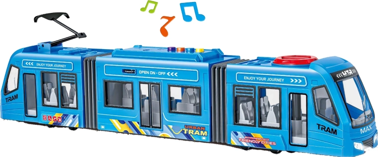 Straßenbahn mit Effekten. Maße 42 × 6,5 × 9 cm. Mit Schwungradantrieb. Licht- und Soundeffekte über Tasten auf dem Dach. 3× AG13-Batterien enthalten. Lenkung der Vorderräder über ein Rädchen auf dem Dach. Öffnen der mittleren Türen über ein Zahnrad oberhalb davon.