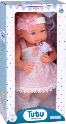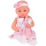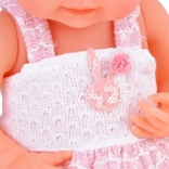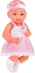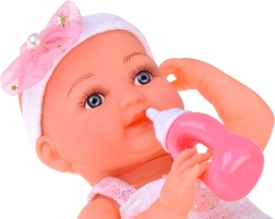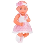 Das freundliche Gesicht der Puppe lädt zum Spielen ein. Das Baby ist in ein weiß-rosa Kleid gekleidet, geschmückt mit Bommeln und Spitze. Zwar hat das Baby keine Haare, aber sein Köpfchen ziert ein Tüllband mit Schleife und Perlen. An den Füßchen trägt es weiße Söckchen.