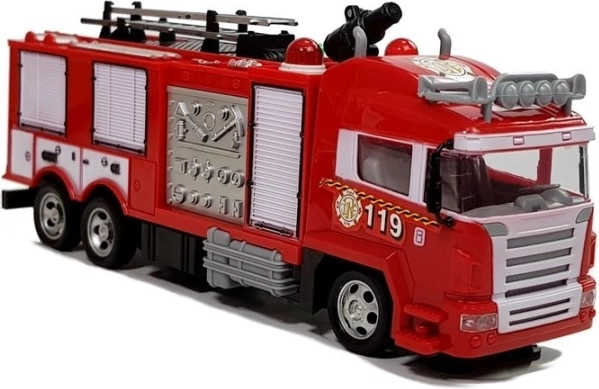 Das rote, große Feuerwehrauto steht auf Rädern mit Gummiprofil. Es meistert problemlos kleine Unebenheiten auf seinem Weg. Das Fahrzeugdesign betont die wichtigsten Elemente, sodass es seinem Pendant in Originalgröße ähnelt.