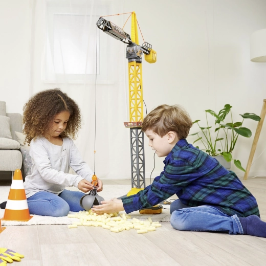 Der VOLVO-Kinderkran von Dickie Toys bringt authentisches Bauen ins Kinderzimmer. Dank 360° drehbarem Ausleger, funktionsfähiger Winde und einer Abrisskugel, die sich öffnen lässt und als Greifer dient, heben und transportieren Kinder mühelos kleine Gegenstände. Die robuste Bauweise und der stabile Standfuß sorgen für sicheres Spielen.