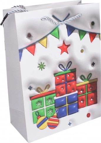 Stilvolle weihnachtliche Geschenktasche in der universellen Größe M (26 × 32 × 10 cm) für einfaches und elegantes Verpacken von Geschenken. Vier festliche Varianten der Drucke verleihen Ihren Geschenken einen zauberhaften Look.
