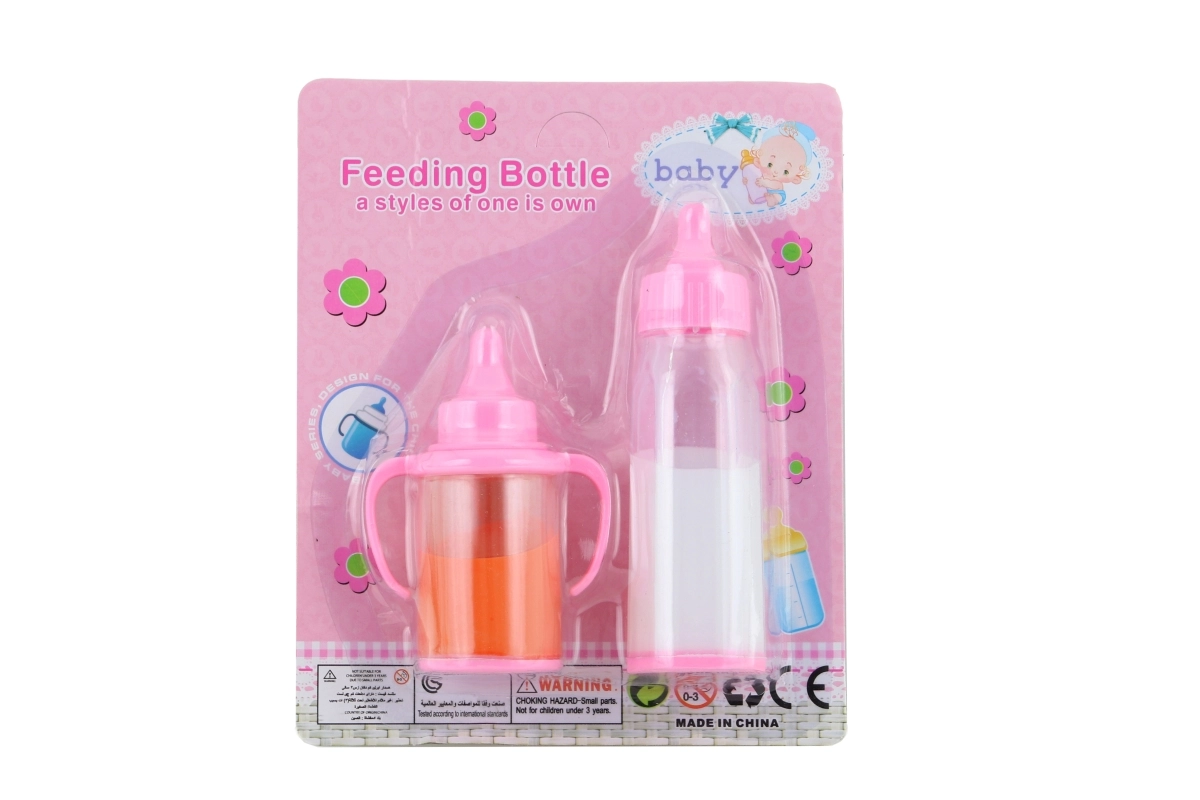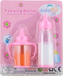 Set aus Fläschchen mit Nahrung für eine Puppe. Material: Kunststoff. Enthält Flüssigkeiten. Auf Karte verpackt. Abmessungen 17×14×3,5 cm. Alter 3+
