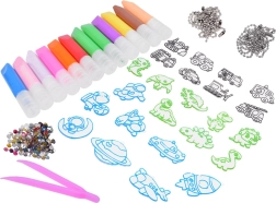 Dieses erweiterte Set bietet Kindern einen spielerischen Einstieg in die Welt des Bastelns. Die speziellen Farben lassen sich leicht in die vertieften Linien der Schablonen einfüllen, laufen nicht über und helfen, präzise und eindrucksvolle Anhänger zu gestalten. Fertige Motive werden mit Dekosteinen verziert und an Metall-Kugelketten aufgehängt – ideal für Schlüssel, den Rucksack oder als Zimmerdeko.