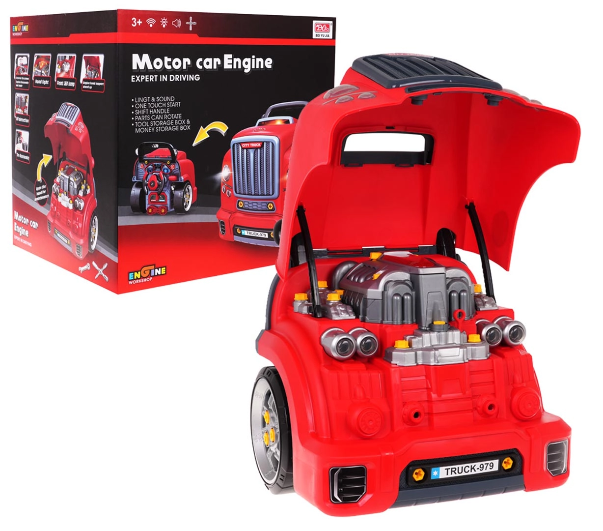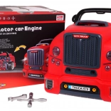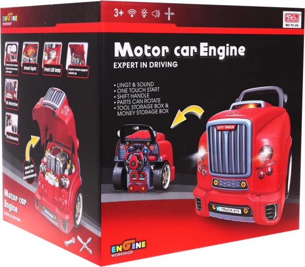Dieses realistische, interaktive Set verwandelt Kinder in geschickte Mechaniker. Die Front des Lastwagens mit hochklappbarer Motorhaube verbirgt einen großen, zerlegbaren Motor, bei dem sich Zündkerzen und Räder wechseln lassen. Auf dem Armaturenbrett befinden sich Startknopf mit Startgeräuschen, Lenkrad mit Hupe, Warnanzeige und Schalthebel. Ein praktischer Tragegriff erleichtert den Transport, unter dem Lenkrad gibt es ein Fach für Werkzeug und Schrauben.