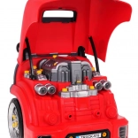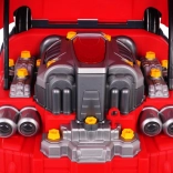 Unter der Haube wartet ein großer Motor, der verschraubt und in Teile zerlegt werden kann – ideal zum Trainieren von Feinmotorik und Logik.
