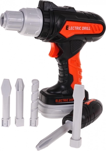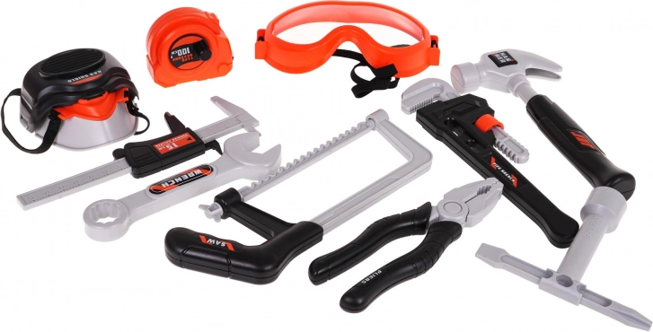 - Werkzeuggürtel, .- interaktiver Bohrer, .- austauschbare Schraubendreher und Bits: Bohrer, Schlitzbit, Kreuzbit, Steckschlüsselbit, .- Schraubnuss, .- Winkelmesser, .- verstellbarer Schraubenschlüssel, .- Schraubenschlüssel, - Zange, .- Hammer, .- 3 kleine Teile zum Verschrauben, .- 3 größere Teile zum Verschrauben, .- 6 Teile in verschiedenen Längen zum Verschrauben, .- 6 x Schraube, .- 6 x Dichtung, - Messbecher, .- Maske, .- Schutzbrille, .- 6 x Dübel, .- Wurfgleiter. . |
