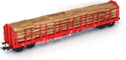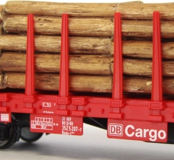Attraktives Modell eines vierachsigen Flachwagens Roos‑t mit Rungen und einer Ladung aus Holzstämmen, in Ausführung der Deutschen Bahn. Wagen dieses Typs werden auch für den Transport weiterer Halbzeuge aus Holz oder auch Stahl genutzt. Die realistisch gestaltete Ladung ist herausnehmbar und auch die Anordnung der Rungen kann verändert werden. Dem Lieferumfang liegen zudem mehrere Ersatzzungen bei. Dank der fein durchdachten Konstruktion, der hochwertigen kontrastreichen Lackierung und des scharfen Drucks kommen die Details der Bauart und der Bedieneinrichtungen bestens zur Geltung. Der Wagenboden bildet auch die Riffelung der Oberfläche vorbildgerecht nach, die Stirnseiten werden außerdem durch separat angesetzte Handgriffe und Tritte verfeinert. Für mehr Abwechslung in Zügen mit zuvor vom Hersteller erschienenen Modellen dieses Typs wurde die Wagennummer geändert. Das präzise konstruierte und montierte Fahrgestell garantiert erstklassige Fahreigenschaften. Hauptmerkmale: vier Achsen, vorbildgerecht gestaltete Ladung, abnehmbare Rungen, NEM‑362 Kupplungsschacht mit Kurzkupplungskinematik