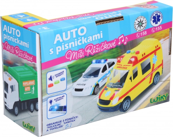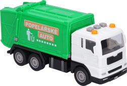 Bereiten Sie sich auf Action vor mit dem 17 cm großen Müllwagen, der durch einen Schwungradantrieb angetrieben wird. Dank Licht- und Soundeffekten bietet es ein realistisches Erlebnis. Die Knöpfe in der Kabine aktivieren drei Lieder von Míša Růžičková: Müllabfuhr, Polizei und Krankenwagen.
