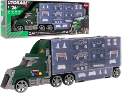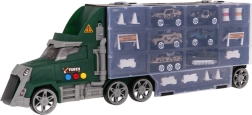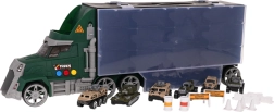 Das Set enthält 6 Metall/gefederte Spielzeugautos des Typs „Resorak“ sowie umfangreiches Zubehör (Kegel, Zäune, Barrieren, Fässer) zum Bau eigener Hindernisstrecken und militärischer Szenarien. Ein praktischer Tragegriff hilft dem Kind, den Lastwagen überallhin mitzunehmen.