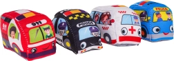 Die Filzmatte und die Plüschautos sind angenehm zu berühren und sanft zu kleinen Händen. Ideal für die ersten Entdeckungen der Welt von Verkehr und Rettungskräften.