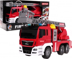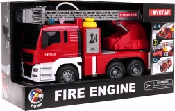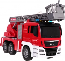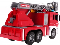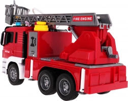 Das Fahrzeug besteht aus robustem Kunststoff, hat Gummireifen für bessere Haftung und Friktionsantrieb für leichtes Fahren ohne Batterien. Die Leiter mit Korb lässt sich manuell heben, senken und ausziehen, der Auslegerarm dreht sich um 360°. Mit dabei sind eine seitliche Klappe mit Zugang für den Feuerwehrschlauch, 4 ausziehbare Stützfüße und eine öffnende Klappe am Ausleger.