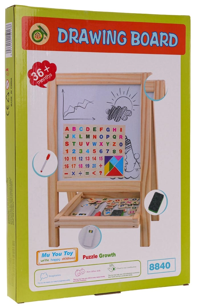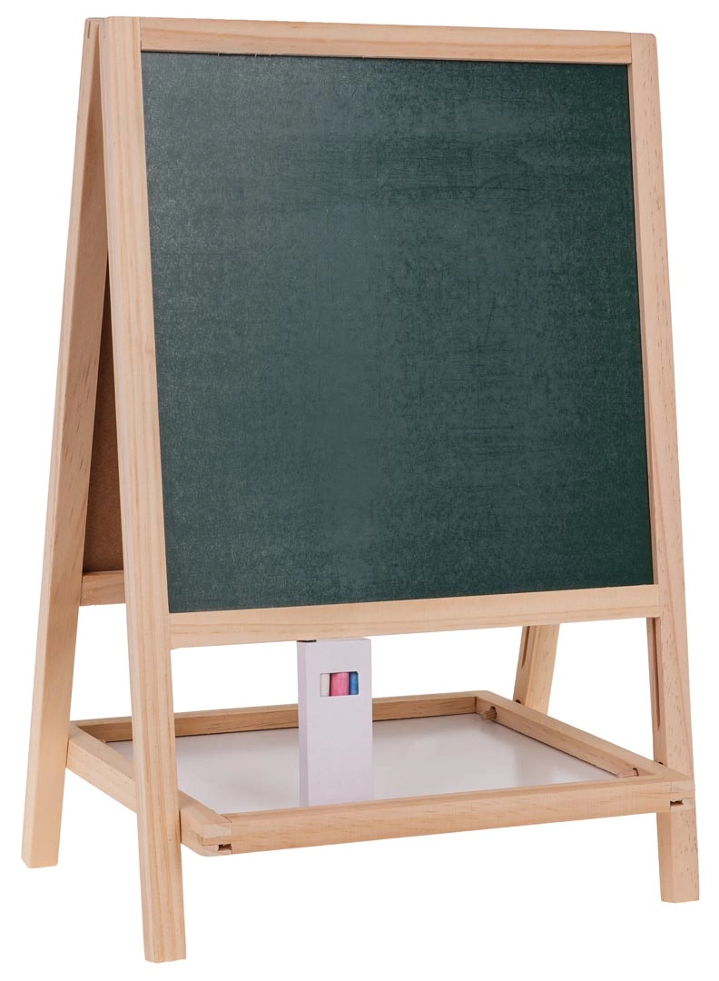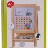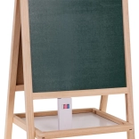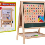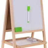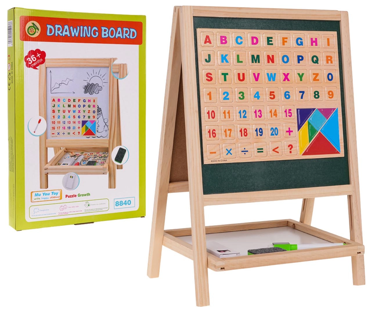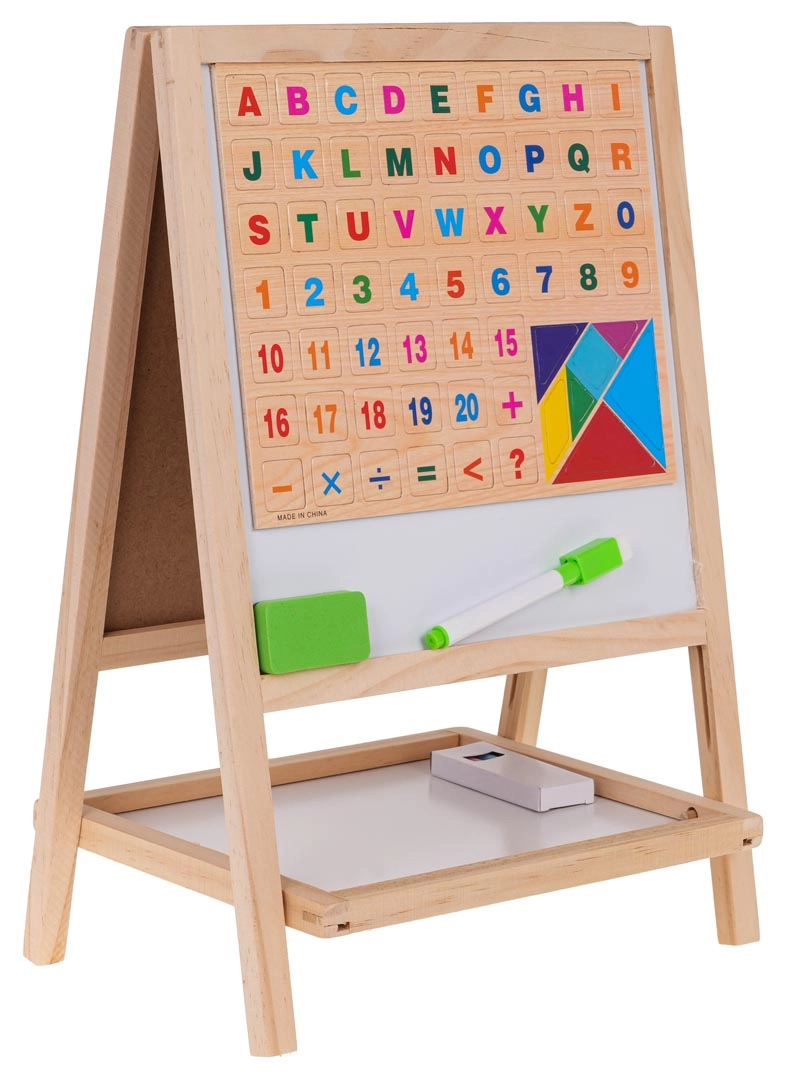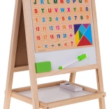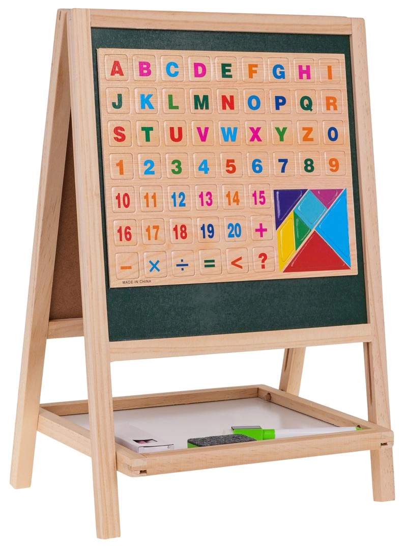 Die doppelseitige Holztafel ist ideal für kreatives Spiel und Lernen für Kinder ab 3 Jahren. Eine Seite kann von Kindern mit einem Stift genutzt werden, während die andere Seite zum Zeichnen mit Kreide verwendet wird. Die Tafel ist auf beiden Seiten magnetisch und ermöglicht das Anbringen magnetischer Buchstaben, Zahlen, mathematischer Operationen und räumlicher Formen. Ein praktisches Regal an der Unterseite der Tafel erleichtert die Aufbewahrung aller beigefügten Hilfsmittel.