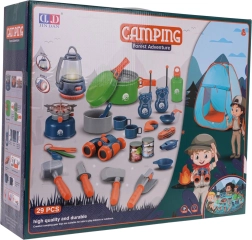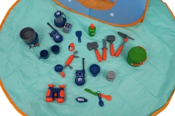 Mit 29 Teilen enthält das Set alles Notwendige für ein unterhaltsames Camping-Spiel, einschließlich Kocher, Lampe und Geschirr.