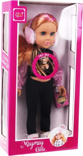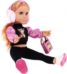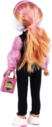 Teil der Puppe ist modische Kleidung, die gewechselt werden kann, und Zubehör wie Handtasche und Winterohrenschützer.