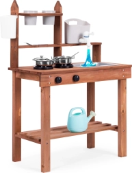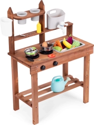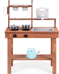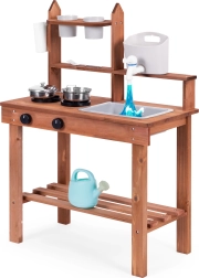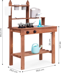 Sie unterstützt Rollenspiele und ermöglicht Kindern, mit Sand, Erde oder Kieselsteinen zu „kochen“. Übersichtliche Regale und Haken halten das Geschirr griffbereit, während die kompakten Abmessungen das Platzieren auch in kleineren Räumen erleichtern.