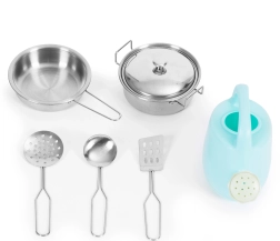 Dazu gehören ein Topf mit Deckel, eine Pfanne, zwei Wender, eine Schöpfkelle und eine Kanne – alles bereit für kleine kulinarische Experimente.