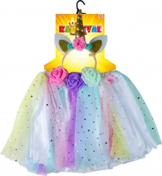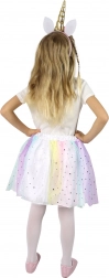 Verwandeln Sie Ihr Kind mit diesem farbenfrohen Kostüm in ein magisches Einhorn, das einen Tutu-Rock und einen Einhorn-Haarreif umfasst. Dieses Set ist ideal für Kinder, die märchenhafte Abenteuer beim Spielen erleben möchten. Der Rock ist mit buntem Tüll und Sternchen-Dekor verziert und dank seines elastischen Bundes leicht anpassbar.